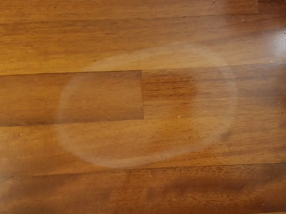 Durch Natriumhypochlorit verschmutztes Parkett: der ovale Fleck wurde durch einen Eimer verursacht, der Bleichmittel enthielt und am Boden nass war